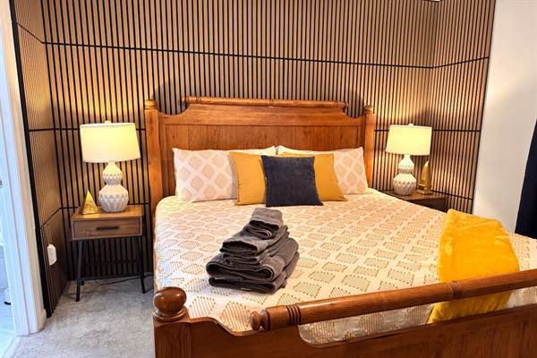 King-sized bed with an en-suite bathroom and walk-in closet. It includes blackout curtains, a full-length mirror, 50” TV, side chair, and table, as well as USB and USB-C charging ports & Pak-N-Play portable crib.
