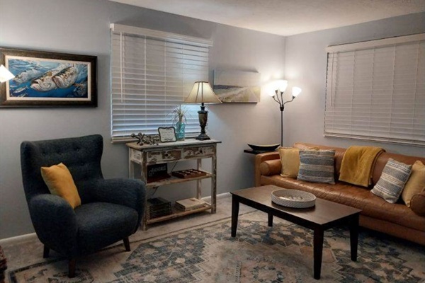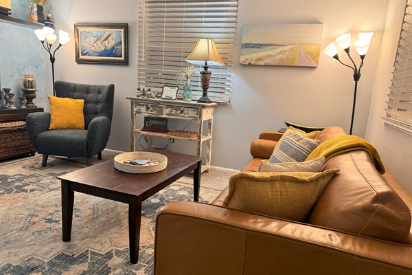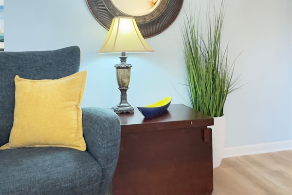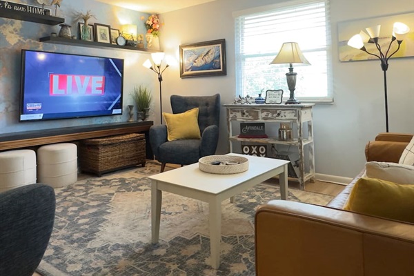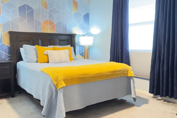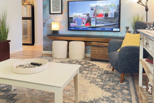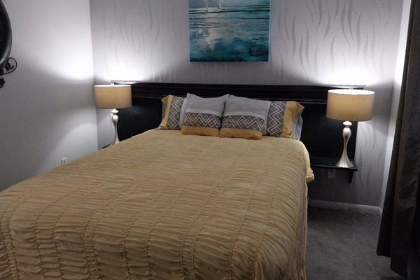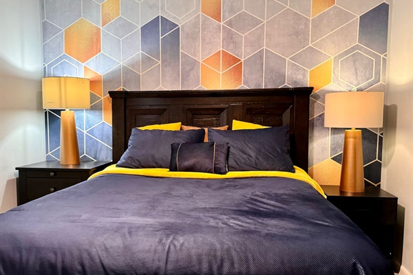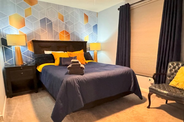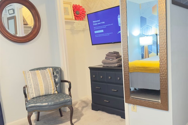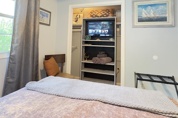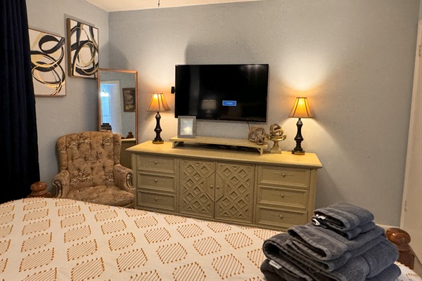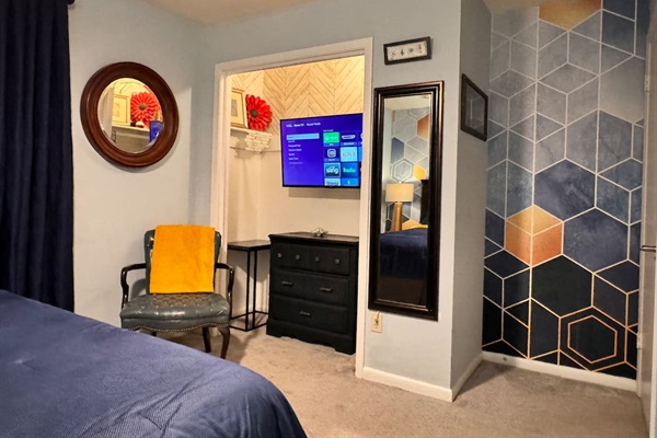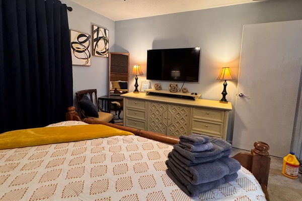 BEDROOM #3Queen bed Lamps (USB outlet at base of lamp) Blue leather chairMirror43" Roku TV Ceiling fan Closet with hangers and storageUSB outlet Extra throw and/or blanketExtra pillows and linenBlackout curtains