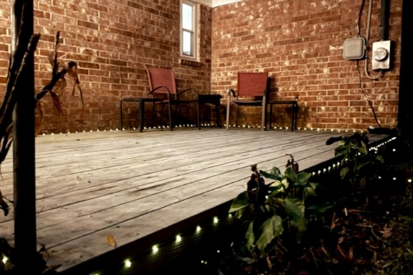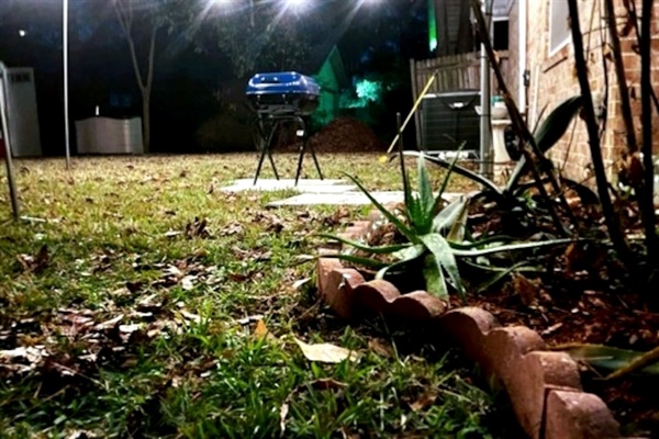 Private, grass covered, back yard area.FencedOutdoor lightingSmall gill.Fire Pit