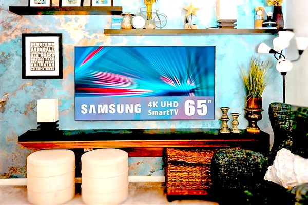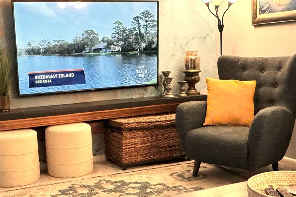 Living Rm: 65” TV, lamps, 2 stools, large chair & wicker box of board games
